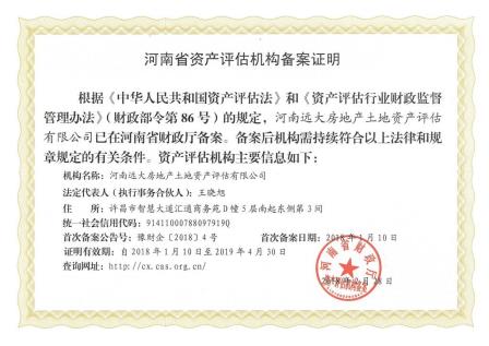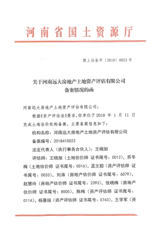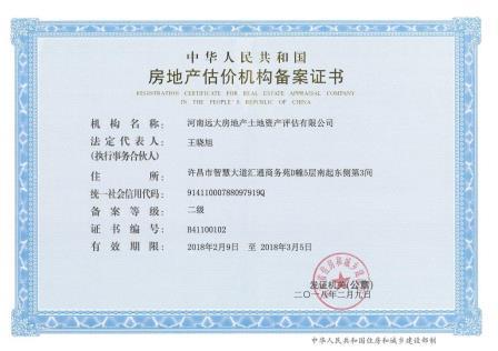2017年,我公司根據新出臺實施的《資產評估法》精神,以及行業(yè)協(xié)會相關管理規(guī)定,在河南遠大房地產估價有限公司房地產單一資質基礎上,變更名稱為河南遠大房地產土地資產評估有限公司,并根據資產評估法和行業(yè)主管部門要求,于2018年1月順利完成了該機構在河南省財政廳資產評估機構備案和國土資源部土地估價機構的備案工作。
