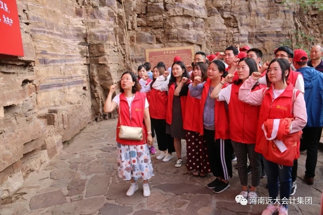 在紅旗渠的咽喉工程青年洞前,全體黨員面向鮮紅的黨旗莊嚴(yán)宣誓,重溫入黨誓詞。