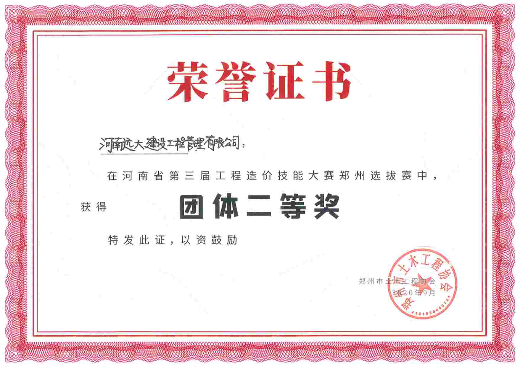 鄭州市第四屆工程造價技能大賽團體二等獎